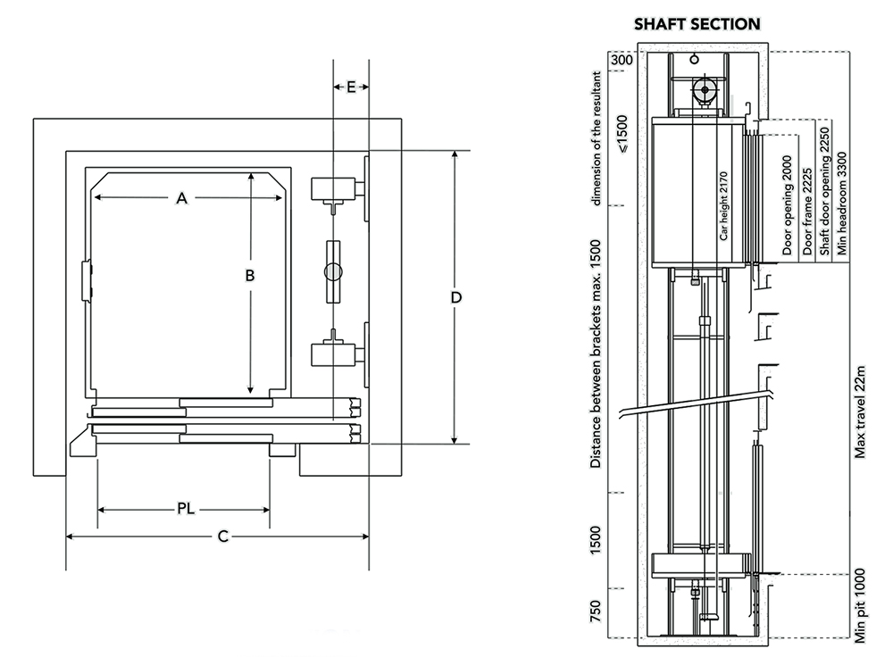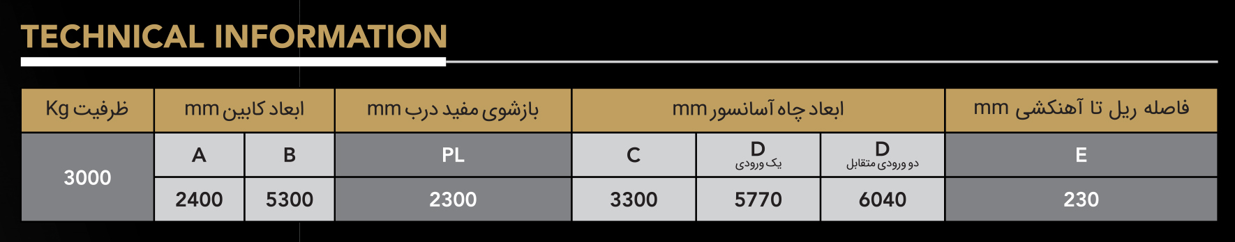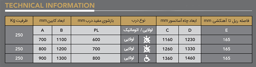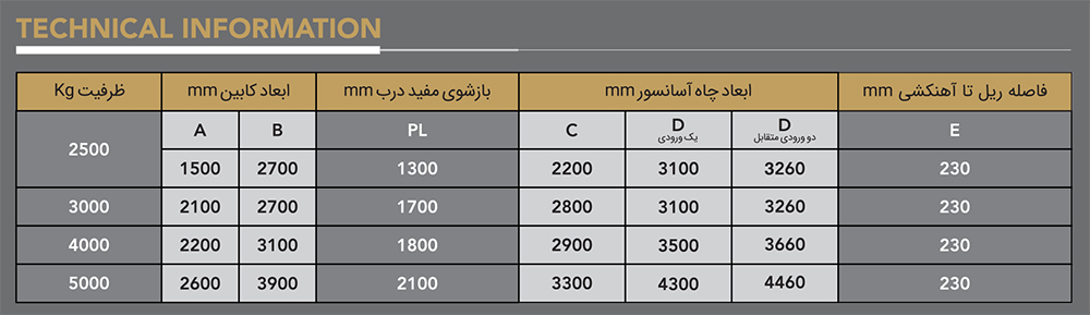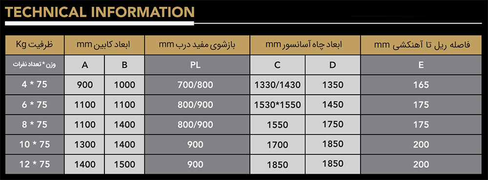 لطفا توجه نمایید: تمامی اندازه های جدول فنی به صورت پیش فرض و بر اساس استاندارد EN81-2 پیشنهاد میگردند و باید در نظر داشت که این ابعاد تا حدودی (+_) میباشند. لذا جهت دریافت اطلاعات دقیق تر با واحد فنی تماس بگیرید.